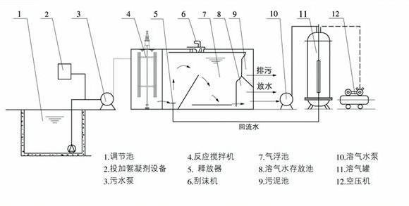 加壓溶氣氣浮在國(guó)內(nèi)外應(yīng)用廣泛,該法師將原水加壓至0.3~0.4MPA,同時(shí)通入空氣,使空氣溶解與水中并達(dá)到相應(yīng)壓力狀態(tài)下的飽和值,然后驟然減至常壓,溶解于水中的空氣以微小氣泡的形式從水中釋放出來(lái),氣泡直徑約為Ø20~Ø100μm左右,目前的基本流程有全部進(jìn)水加壓溶氣氣浮、部分進(jìn)水加壓溶氣氣浮、部分處理水回流加壓溶氣氣浮等三種,都是由加壓泵、溶氣罐、釋放器和氣浮池等基本設(shè)備組成。