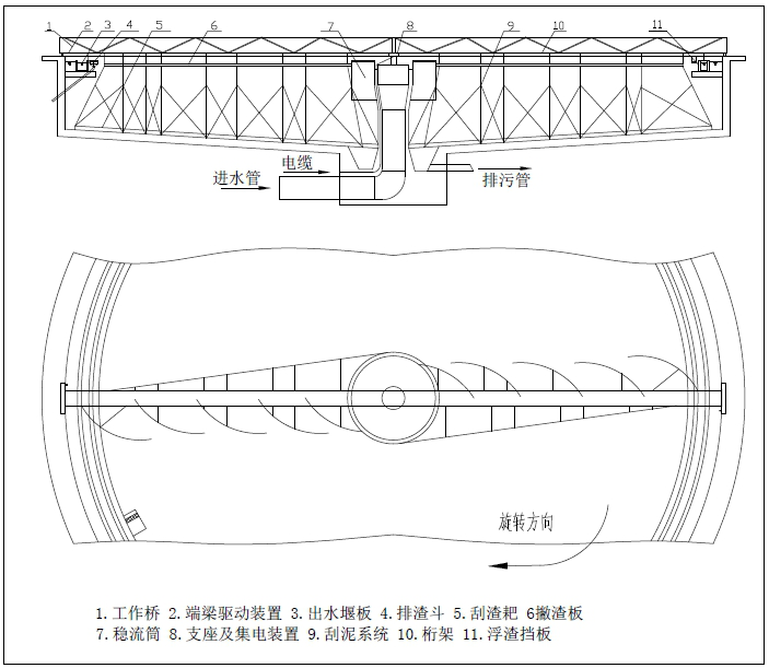 ZBG型周邊傳動(dòng)吸泥機(jī)主要由穩(wěn)流筒、集電裝置、中心支座、工作橋(主梁)、刮泥結(jié)構(gòu)、排渣機(jī)構(gòu)、驅(qū)動(dòng)裝置、行走裝置和電控箱等部分組成。
